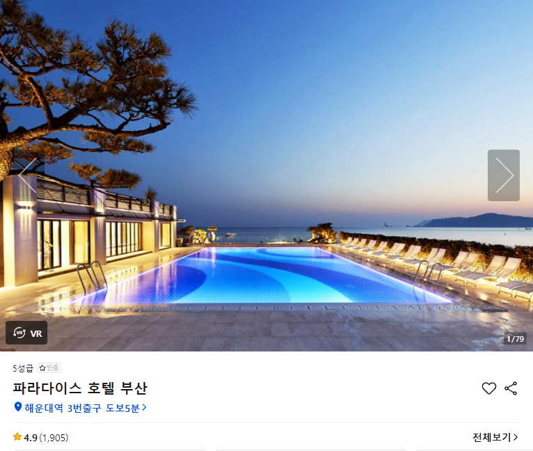 해운대에 위치한 파라다이스 호텔은 부산을 대표하는 럭셔리 호텔 중 하나입니다. 해변을 바로 앞에 두고 있어 최고의 위치를 자랑하며, 스파와 수영장 등 다양한 편의시설을 갖추고 있어 호캉스를 즐기기에 제격입니다. 평점이 매우 좋은 호텔 중 하나입니다. 현재 기준 평일 금액 본관 시티 더블 기준 302,500원으로 확인 됩니다!