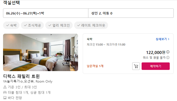여수의 히든베이 호텔은 아름다운 오션뷰와 함께 조용하고 편안한 분위기를 제공해요. 친절한 직원 서비스와 깨끗한 객실 상태로 많은 여행객들이 만족해하는 곳입니다. 여수의 아름다운 바다를 감상하며 여유로운 시간을 보내고 싶다면 추천드려요. 현재 기준 평일 금액 디럭스 패밀리 트윈 기준 122,000원으로 확인 됩니다!