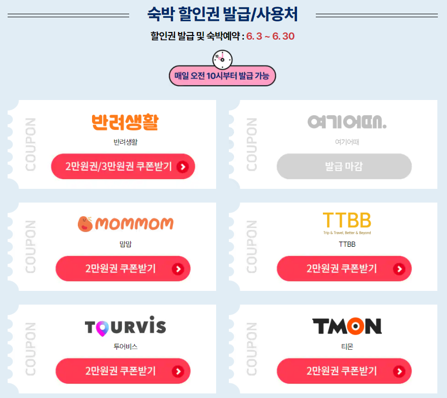야놀자는 숙박세일페스타의 공식 파트너로서, 쉽게 참여할 수 있는 다양한 방법을 제공해요. 먼저 아래 홈페이지를 통해 매일 오전 10시에 오픈하는 숙박세일페스타 쿠폰을 다운로드하세요. 매일 선착순으로 마감되니 빠르게 다운로드 받으셔야합니다!!